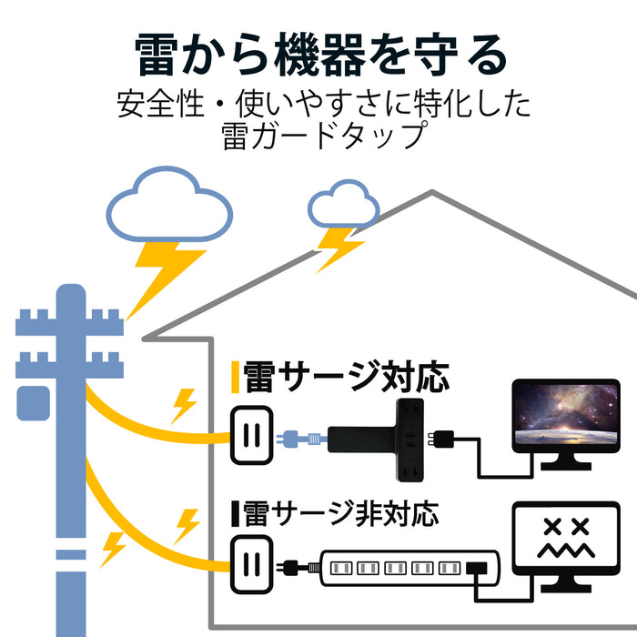 ■誘導雷による最大12500Vまでの雷サージを吸収する素子(バリスタ)を搭載し、接続機器を保護します。(※最大サージ電圧12500VはJEC210/212規格に基づく数値です。受けた電圧や回数により性能は劣化します。)