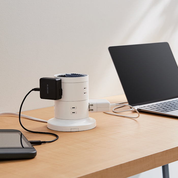 ■タワー型のため、差込口が多くても小さな面積で設置でき、360度あらゆる方向から接続できるので、会議室のデスクなどでの使用に便利です。
