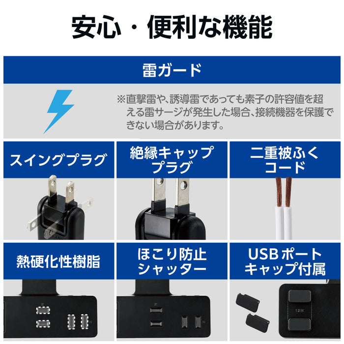 ■3つのAC差込口、2つのUSB-Aポートを備えており、USBケーブルによる充電も可能です。