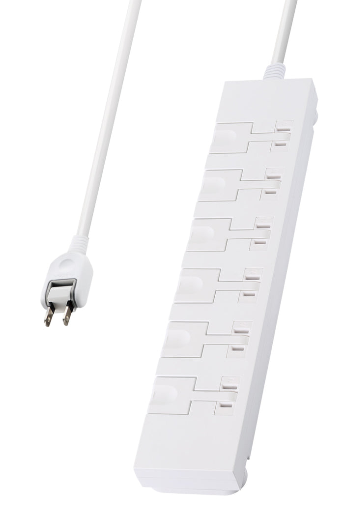 ■レバーを押すだけで簡単に、片手でプラグを抜ける6個口のタップです。タップを手で押さえたりプラグを強い力で引き抜いたりする必要はありません。