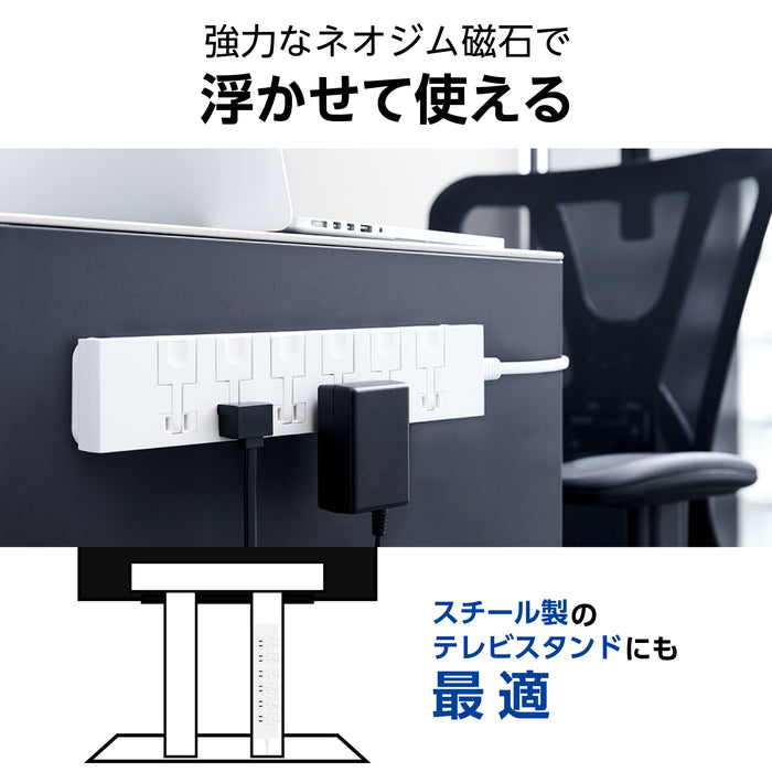 ■強力なネオジム磁石付き。デスクの脚やスチール家具などに吸着させて、床面以外に設置して使用できます。座った状態でプラグの抜き挿しも可能。吸着力が高く、プラグを複数挿しても落下しにくい設計です。