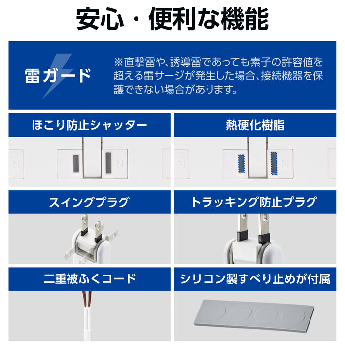 ■サージ電流耐量2750A/5回、2500A/10回、制限電圧935Vmax(500A 8/20μs)の素子(バリスタ)を搭載しており、誘導雷による雷サージを吸収して接続機器を保護します。
