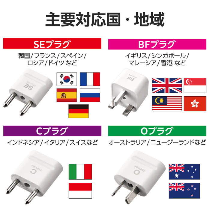 ■使用可能地域:上記対応国はエレコムの独自調査によるものです。国、地域によってコンセント形状が異なりますので、予めご宿泊先や旅行代理店にご確認ください。