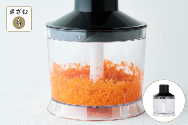 チョッパーなら、手間のかかるみじん切りもあっという間に均一に仕上がります。専用ボトルに材料を入れて、そのまますばやく処理できます。 -