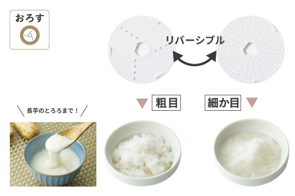 両面おろし刃で粗さを選べるので、鬼おろしから細かいおろし、長芋のとろろまで、好みの食感に仕上げられます。 -