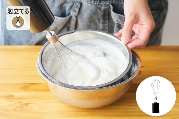 バルーンビーターで生クリームのホイップもスピーディーに。メレンゲ作りもでき、お菓子作りの幅が広がります。 -