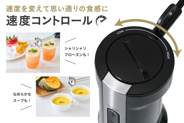食材の状態や仕上がりの好みに合わせて速度を調整することで、狙いの食感に。高速でブレンドすると細かくなめらかに、低速では砕き過ぎを防いで粗めに仕上げ、風味と食感を保てます。本体上面のつまみを回して、好みの速度を無段階に調整できます。 -