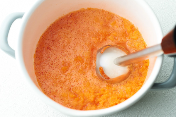 効率よく材料をつぶす4枚刃は、鍋に直接入れられるのでスープ作りもお手軽に。金属製なので臭いや色移りなく清潔に使えます。