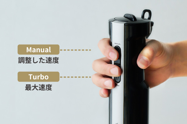 握りやすい、くびれのあるグリップ形状を採用。人差し指と中指が自然に届くスイッチは軽い力で押しやすく、作業効率が向上します。上のスイッチ(Manual)は調整した速度で、下のスイッチ(Turbo)は最大速度で動作します。 -