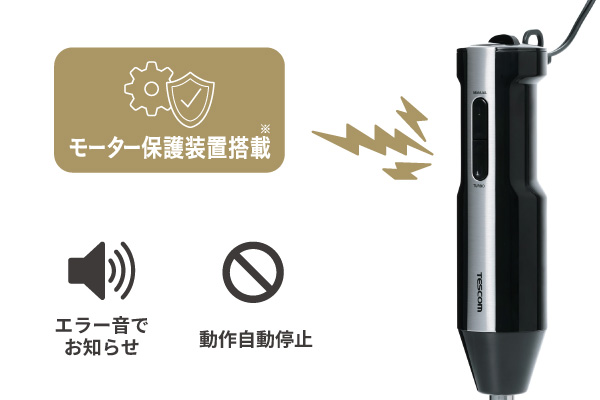 食材の入れすぎや定格時間を超えての連続使用など、過負荷を検知するとエラー音でお知らせします。動作を自動停止し故障を未然に防ぎます。