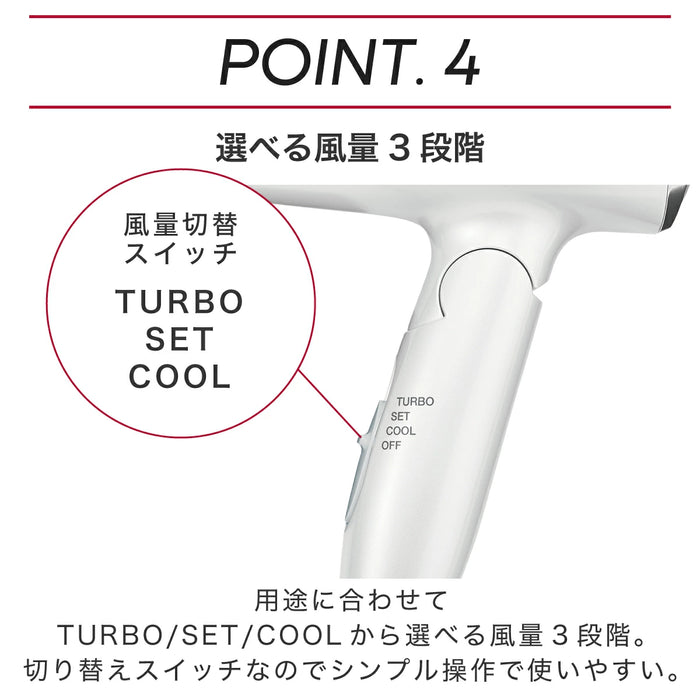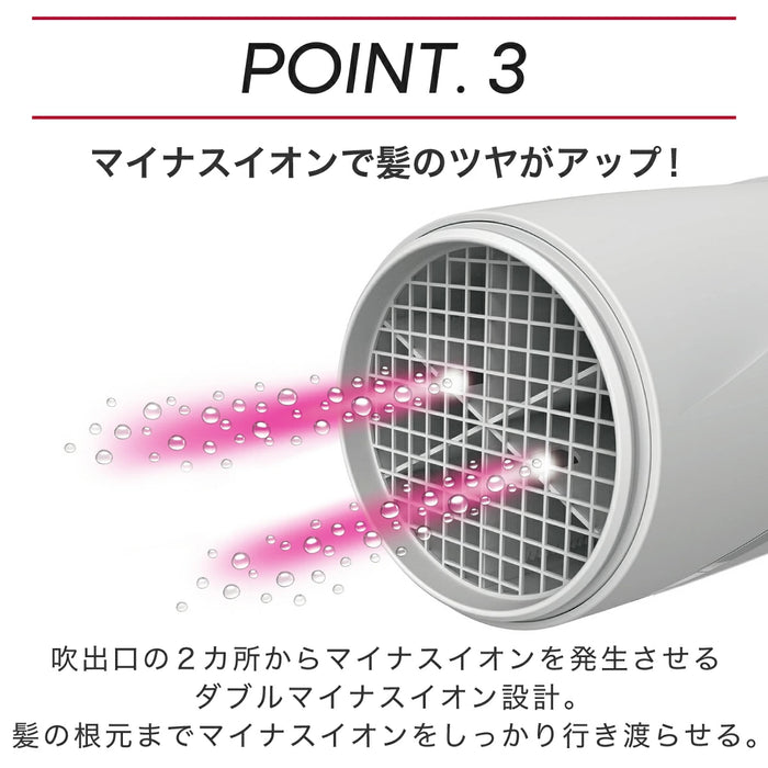 435g(フード付)消費電力 1200W 付属品 セットフード 電源 AC100V 50/60Hz スイッチ TURBO-SET-COOL-OFF 折りたたみ 〇 マイナスイオン発生吹出口 ダブルマイナスイオン(マイナスイオン2ヵ所吹き出し) 温風温度 85℃(TURBO時、フード無し。周囲温度30℃の場合) 海外仕様 × 風量(㎥/分) 1.7㎥/分(TURBO時) 搭載イオン マイナスイオン ラク抜きプラグ × カラー/JANコード -W/DE ホワイト:4975302133199 -P/E ピンク:4975302133175