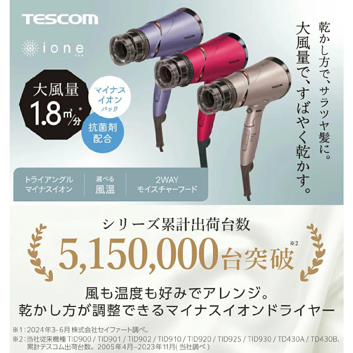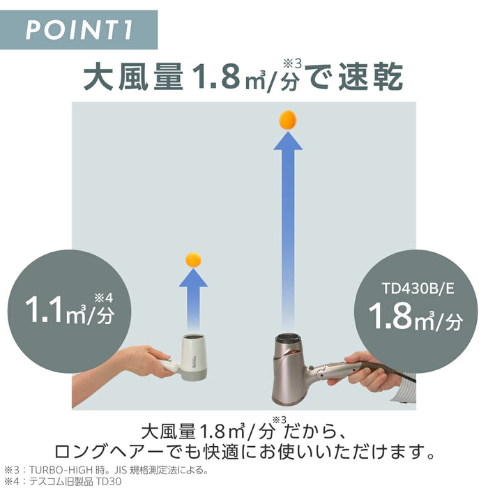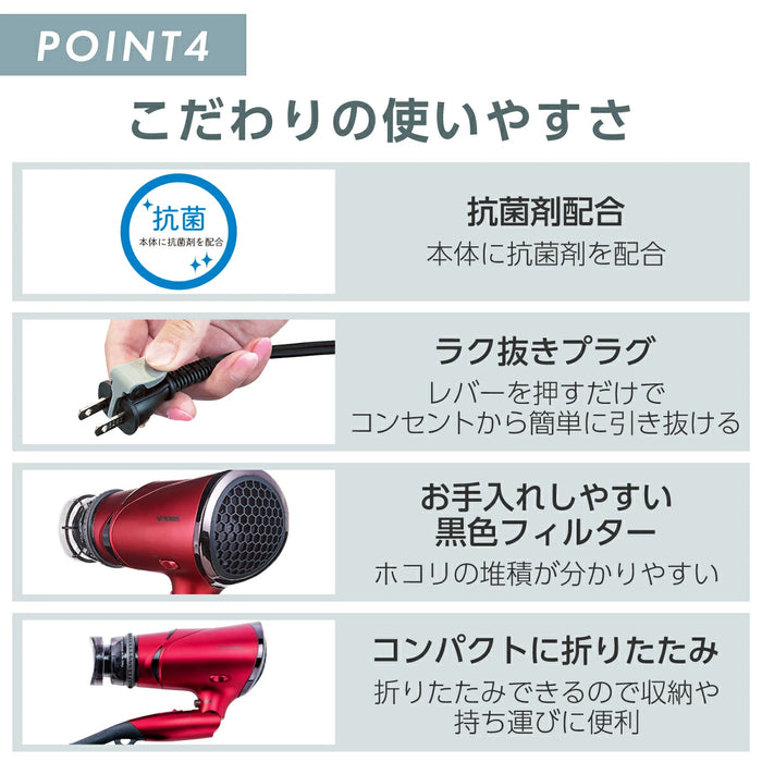 クールショットスイッチ折りたたみ 〇 マイナスイオン 〇 マイナスイオン発生吹出口 トライアングルマイナスイオン(マイナスイオン4ヵ所吹き出し) 温風温度 115℃(周囲温度30℃の場合。DRY‐HIGH使用時。) 風量(㎥/分) 1.8㎥/分(スイッチポジションTURBO-HIGH使用時) 搭載イオン マイナスイオン ラク抜きプラグ 〇 海外使用 × カラー/JANコード -V/E パープル:4975302193575 -N/DE ブロンズ:4975302143075 P/E ピンク:4975302193599