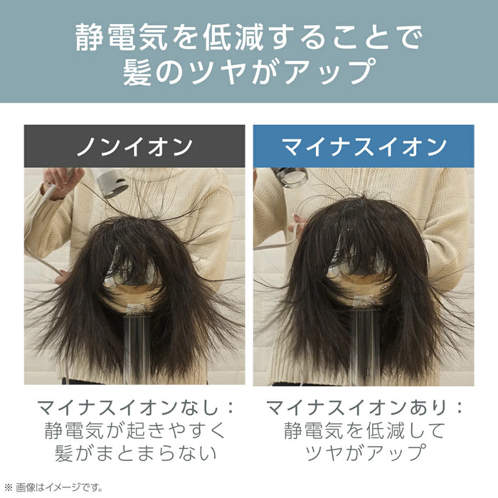 独自の放出方式で、熱による減少に負けず髪全体にマイナスイオンを行き渡らせます。髪の広がりの一因である静電気を低減し、髪のツヤもアップ!