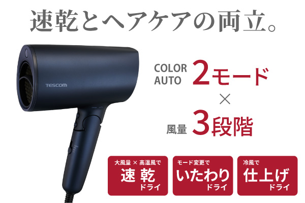 速乾とヘアケア効果の両立を実現。大風量2.0m3/分(※)の風で速乾ドライやモード変更でいたわりドライなど、モードや付属のセットフードを組み合わせてシーンによって使い分け。3段階の風量と2つのモードでお好みの使い方を選べます。