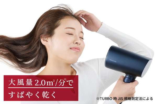 1300Wのハイパワーにより温風をしっかりキープし、大風量2.0m3/分の風で髪をすばやく乾かせるので、忙しい朝も時短でヘアドライができます。 -