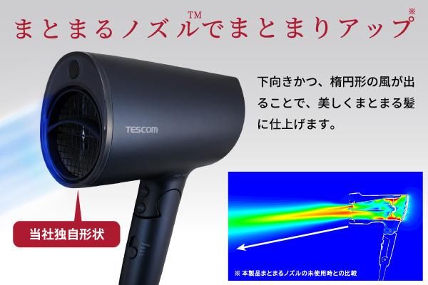 独自設計の「まとまるノズル™」により、乾かすだけで髪のまとまりが約9%アップ(※)します。下向きで楕円形に出る風が髪を優しく引っぱりながら乾かし、美しくまとまる髪に仕上げます。ヘアドライの基本である上から下に向かって乾かす動作を、使うだけで簡単に実現できます。
