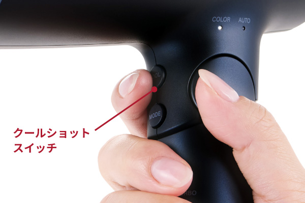 クールショットスイッチを押せば、ワンタッチですぐに冷風に切り替えられます。冷風をヘアドライの仕上げに使うと、スタイリングを長時間キープしやすくなります。 -