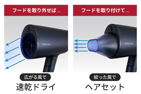 セットフードを取り付けることで、風の出口が絞られ、直線的でピンポイントな風が出ます。毛先のセットや前髪の立ち上げなどにおすすめです。 -