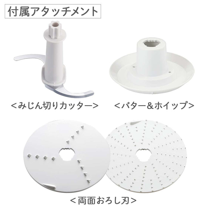 (連続使用可能時間)1分(1分動作後は15分休止) 容器容量 300g(液体含む) 機能 ・きざむ、まぜる、おろす(粗目/細か目)、泡立てる