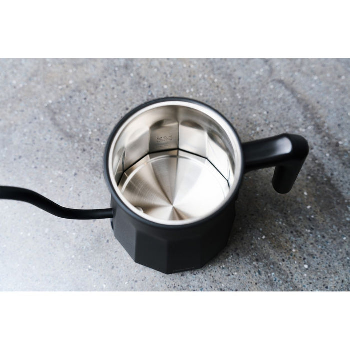 ブラックで統一したスタイリッシュなたたずまいは、キッチンやダイニングに映え、コーヒータイムを引き立てます。多角形のボディに調和するハンドルは、手にフィットするちょうどよい太さで、注ぎやすく、さまざまな握り方に対応します。 -