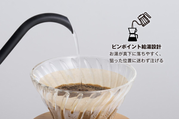 緻密に設計された独自のノズル形状により、狙った場所に正確にお湯を注ぐことができるコーヒードリップに適したバリスタ仕様です。湯切れがよく、先端をわずかに下げた注ぎ口形状によってお湯は真下へ落ち、注ぎ始めの位置決めも迷いません。細く安定したお湯の流れを思い通りにコントロールでき、繊細な風味を引き出せます。 -