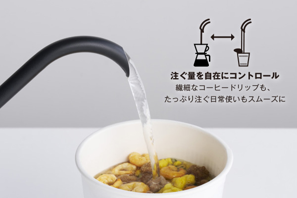 コーヒードリップのようにゆっくり少しずつ注ぐときも、カップ麺に一気にお湯を入れたいときも、自在に対応できます。お湯の量やスピードを自由に調整でき、毎日のさまざまな場面で快適に使えます。 -
