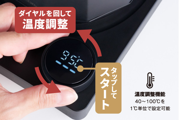 コーヒー豆の種類や焙煎度、紅茶や日本茶といった素材に合わせて、40~100℃の範囲で1℃刻みの温度設定が可能です。最適な温度で抽出することで、素材本来の豊かな風味を最大限に引き出し、一杯ごとの味わいの違いが生まれます。 -