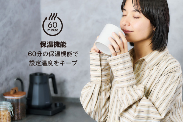 60分間の保温機能でお湯を一定の温度にキープ。いつでも最適な温度でスムーズに抽出を始められ、冷める心配なく理想のタイミングでコーヒーを淹れられます。 -