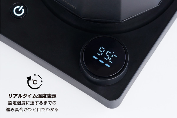 昇温中の温度をリアルタイム表示で確認できます。設定温度に近づく様子を見ながら余裕をもって準備でき、最適なタイミングで抽出を開始できます。 -
