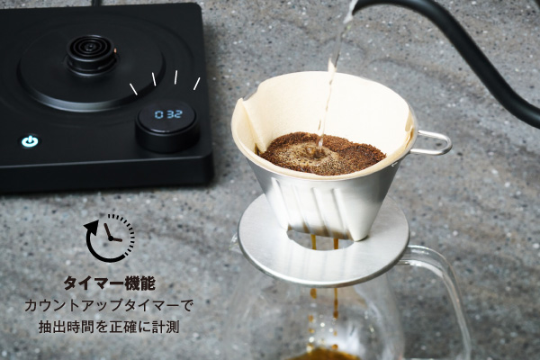 カウンター機能で、ドリップ中の時間を正確に計測できます。抽出時間は風味に大きく影響するため、開始から終了までをプロのバリスタのように細かく管理することで、安定して高品質なコーヒーを淹れられます。