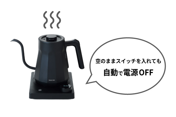 空焚き防止機能により、空のままスイッチを入れても自動で電源がオフになります。 -
