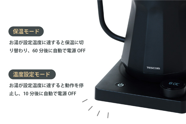 保温モードでは、お湯が設定温度に達すると保温に切り替わり、60分後に自動で電源が切れます。温度設定モードでは、お湯が設定温度に達すると動作を停止し、10分後に自動で電源が切れます。自動で電源がオフになるので、ケトルから離れていても安心して使えます。