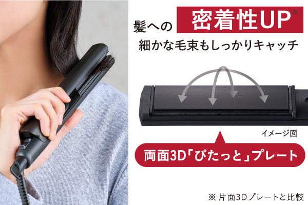 両面3D「ぴたっと」プレートを搭載し、髪の流れに沿って両面のプレートが上下左右に傾いて、細かな毛束にもしっかり密着。毛先まで逃さず、しっかりキャッチして整えます。 -