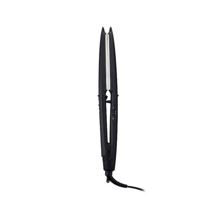 髪の流れに沿ってプレートが傾き、ぴたっと密着。毛先も後れ毛も逃さずキャッチします。 -